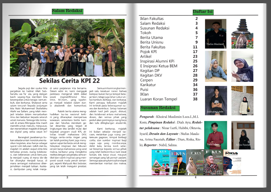 Di dalam majalah ini, kita nggak cuma bicara soal teori di kelas, tapi juga menangkap momen, isu terkini, hingga sisi lain kehidupan kampus yang jarang terekspos. Mulai dari desain visual yang fresh sampai artikel yang bikin kita berpikir kritis—semuanya dirangkum jadi satu di sini.